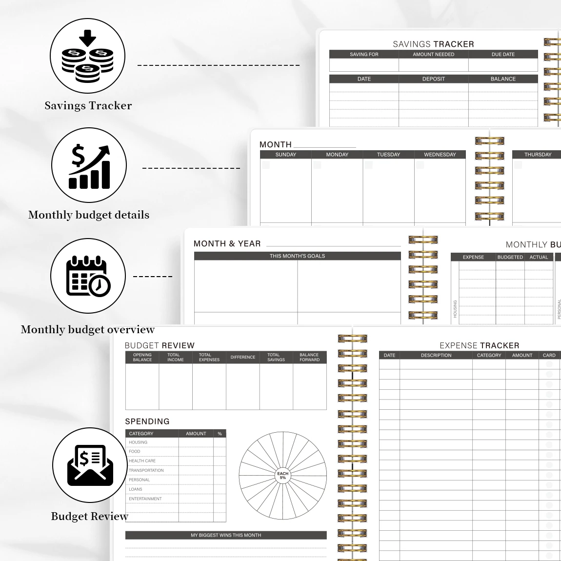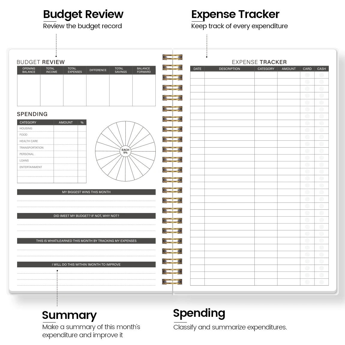Features budget review pages, categorized spending sections, and detailed trackers for organized monthly planning.